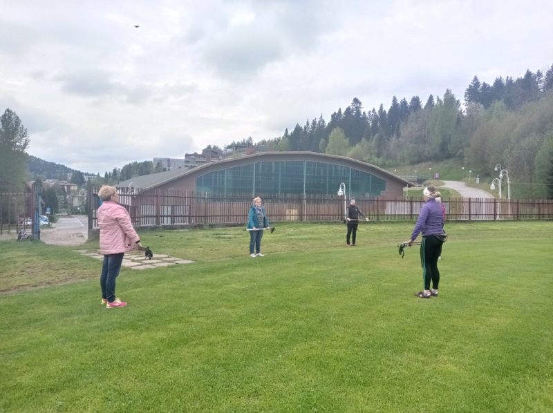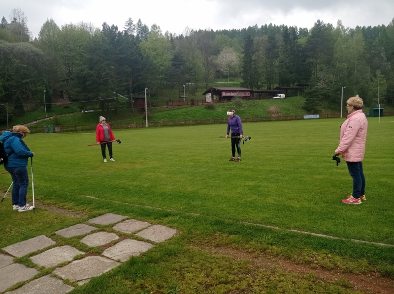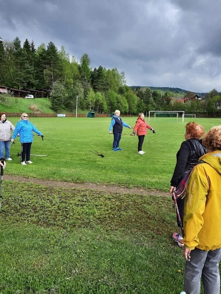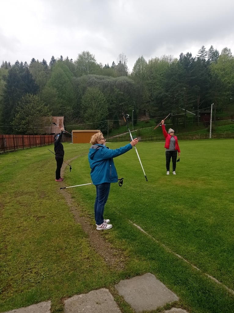 Zajęcia pilatesu , połączone z nauką chodzenia z kijkami do nordic walking w plenerze czyli na stadione piłkarskim .